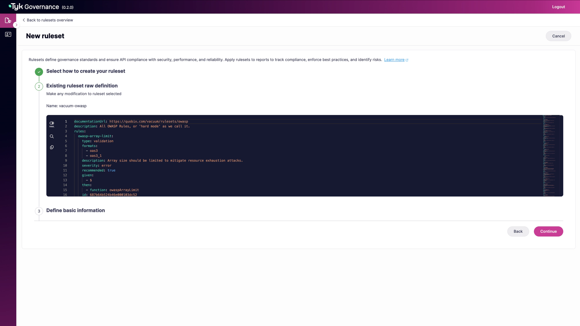 Navigate to the Rulesets section in your Tyk Governance dashboard.